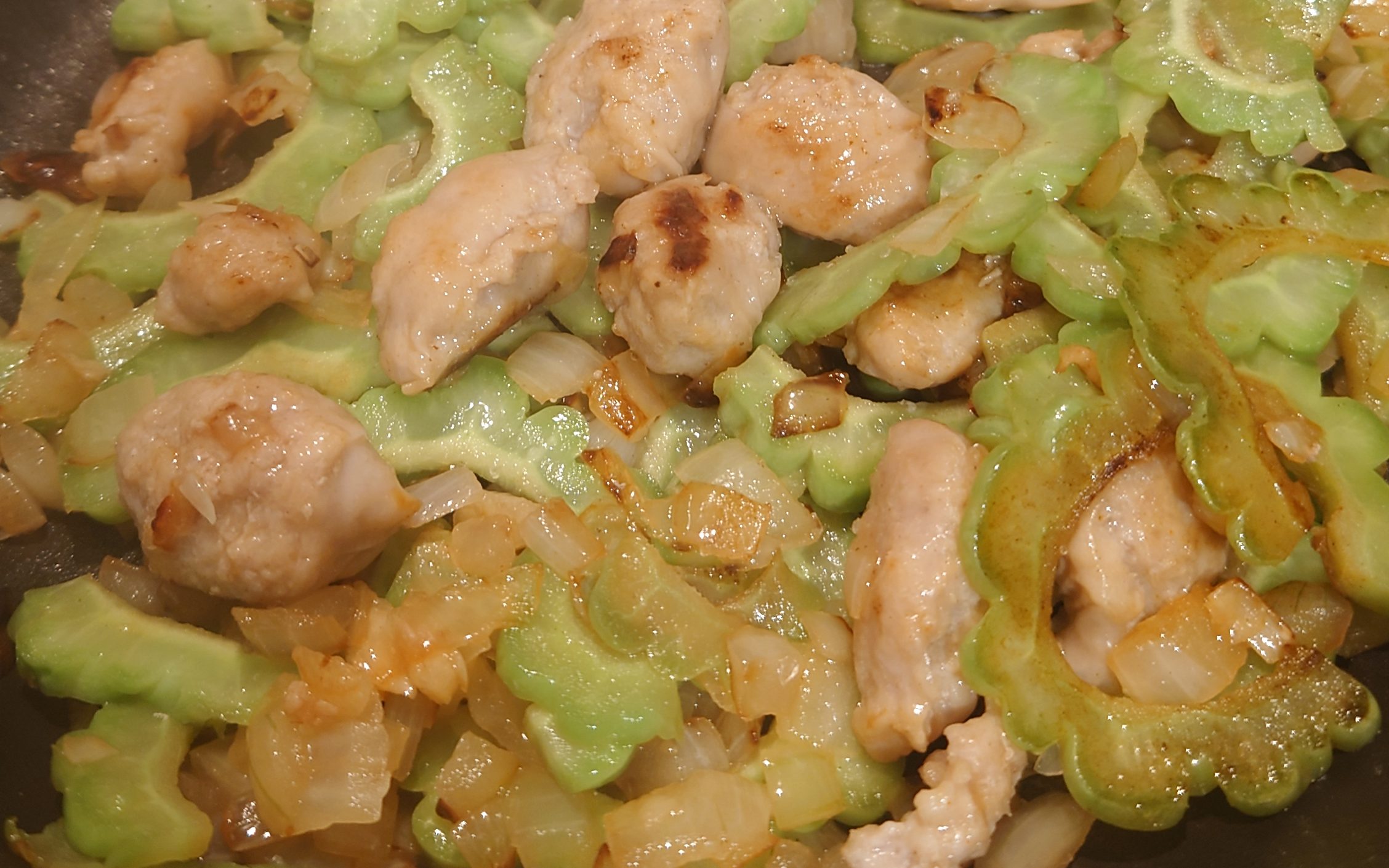 Step 8: Once the garlic and onions have browned, add the bitter gourd.