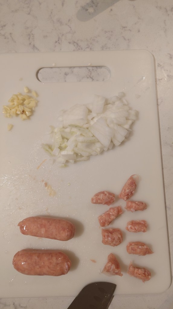 Step 3: Slice your pork sausage, or for vegetarians, crack an egg into a bowl and mix.