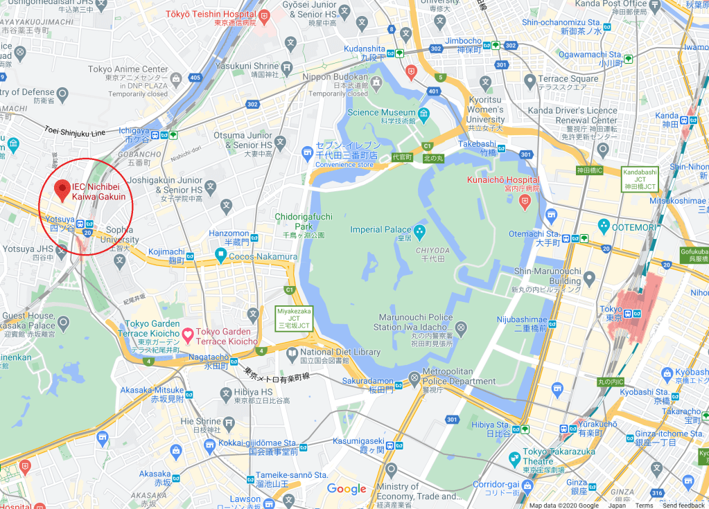 The images above showcases the present location of the Nichibei Kaiwa Gakuin, an accessible 3-minute walk from the Yotsuya Train Station. The educational hub is located in the Global Study Square of Comore Yotsuya building – a new and iconic mixed-use development at the heart of the business district of Tokyo. Being only minutes walk from the Imperial Palace and Sophia University.