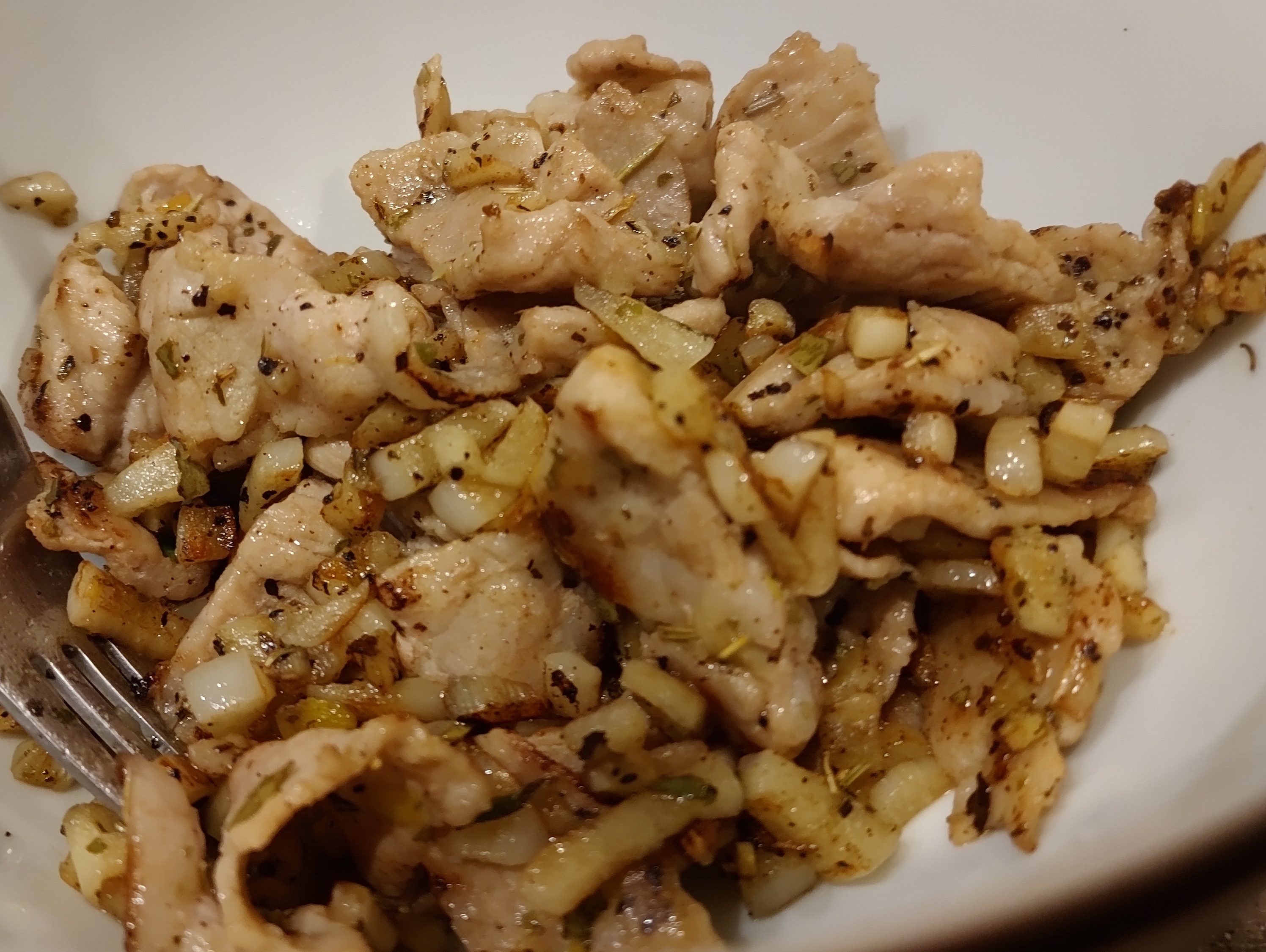 Once all the water has evaporated, then add the herbs, salt and pepper. Mix and allow to simmer until the meat turns into a light brown, golden brown or brown of your choosing.