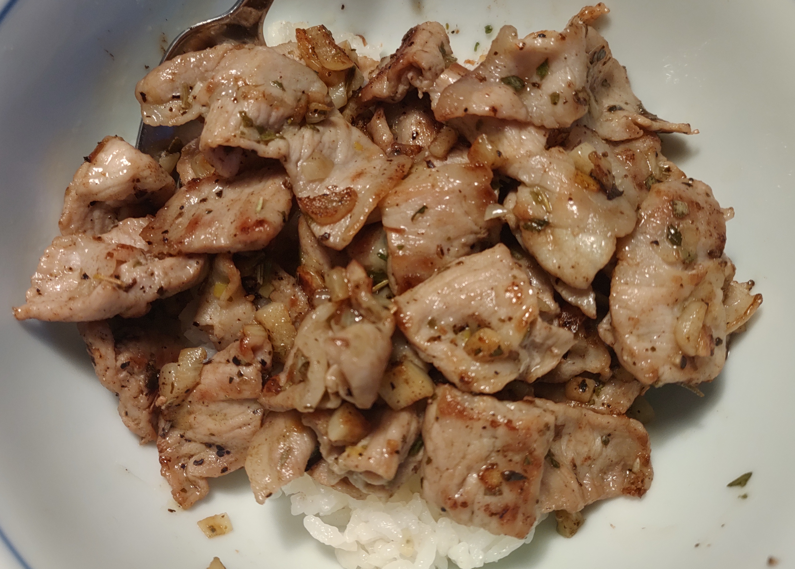 Once the pork begins to change from a raw pink colour to a light biege, then add a bit of water. This will allow the butter and garlic to seep into the meat and prevents the meat from drying during the cooking process.