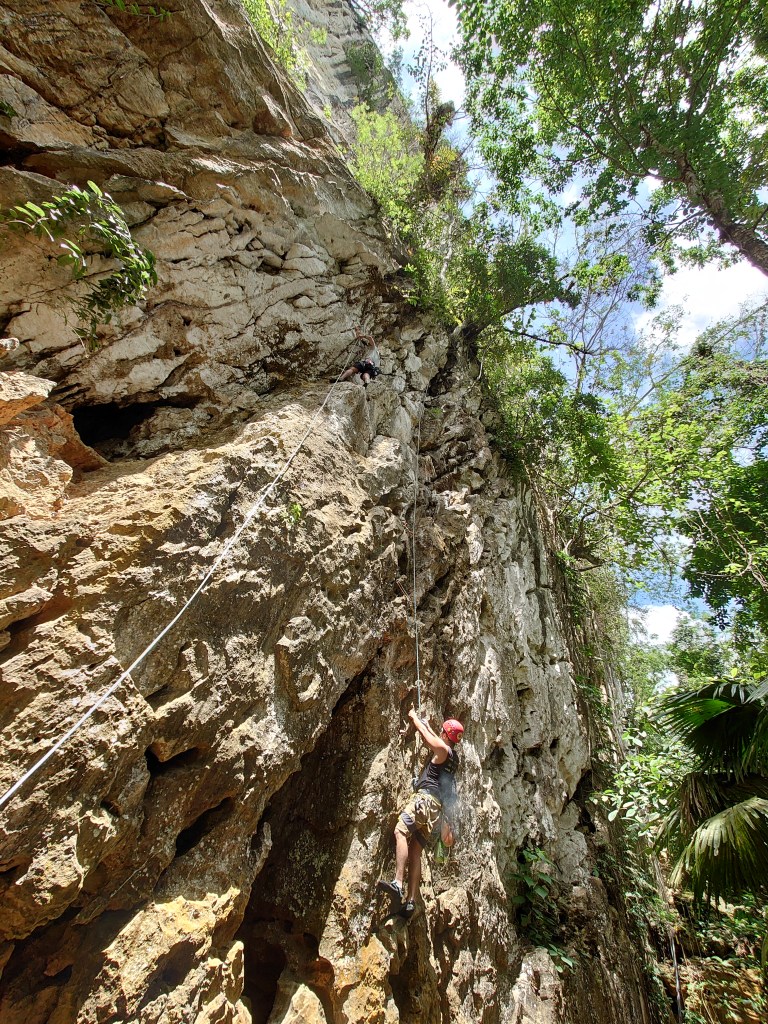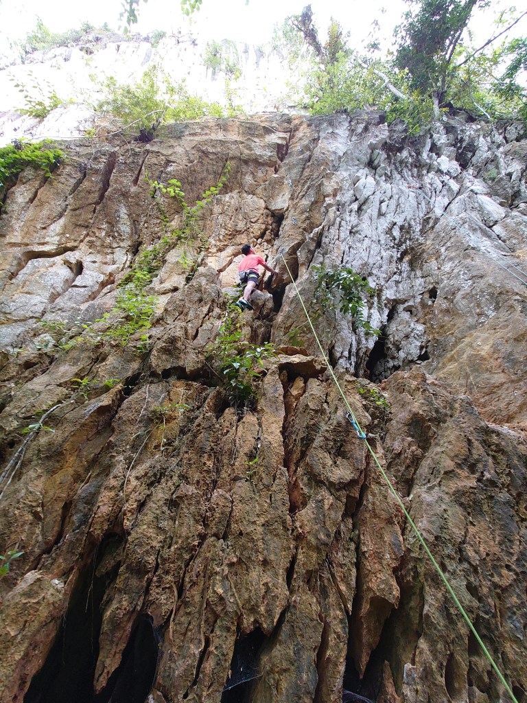 It is the first time in my adult life to climb outdoors, and I am happy it was done at Cantabaco’s quiet oasis surrounded by tropical rainforest, visiting butterflies and captivating echoes of birds from the neighbourhood. The sun caught the rocks around noontime and smoothly ran its rays down the limestone illuminating each bump, bend and point.